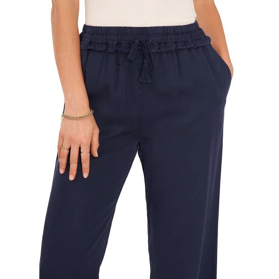 - Mid rise elastic drawstring waist with ruffle detail